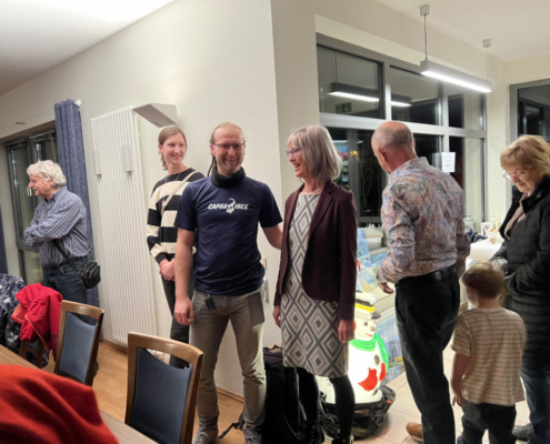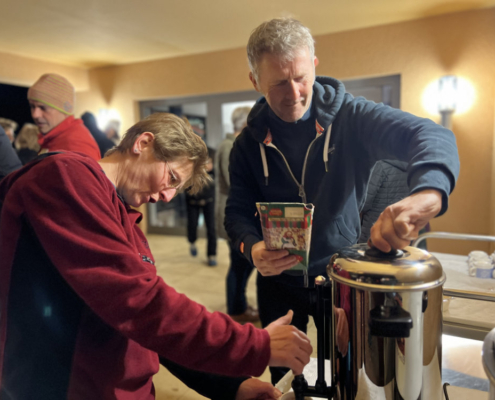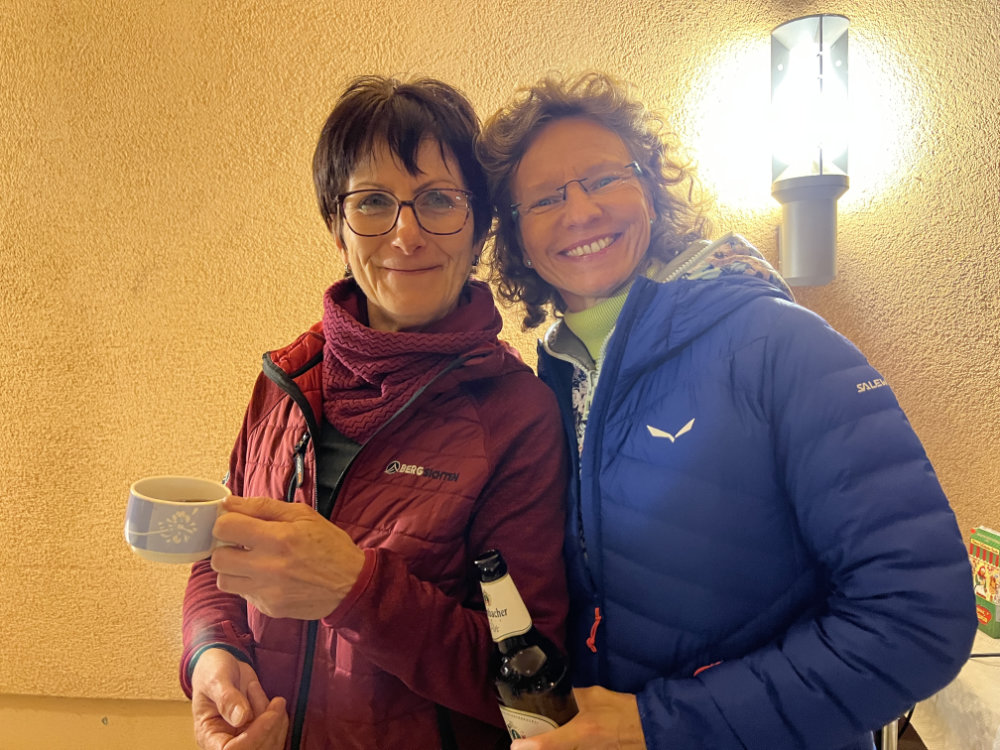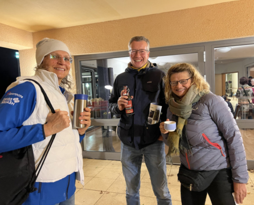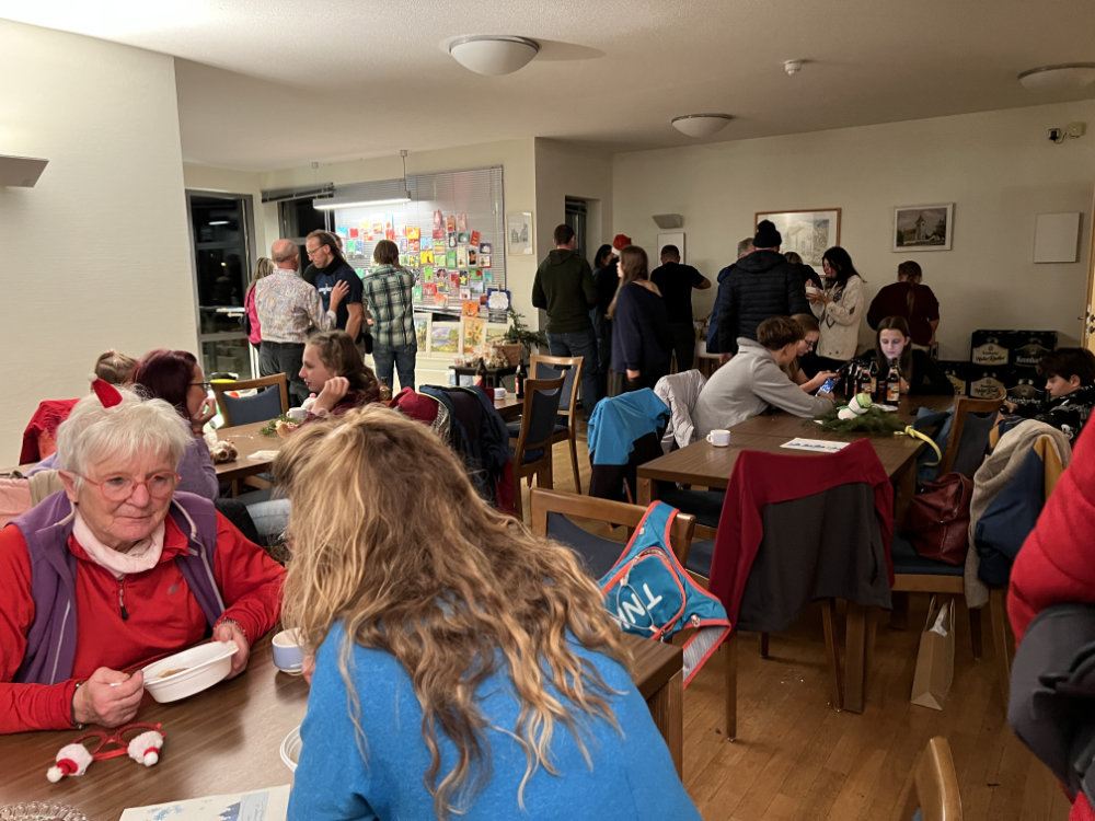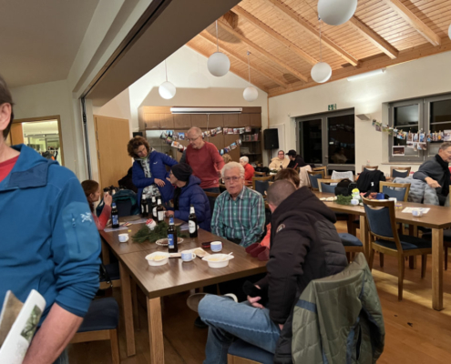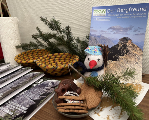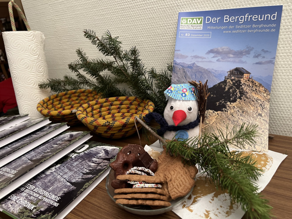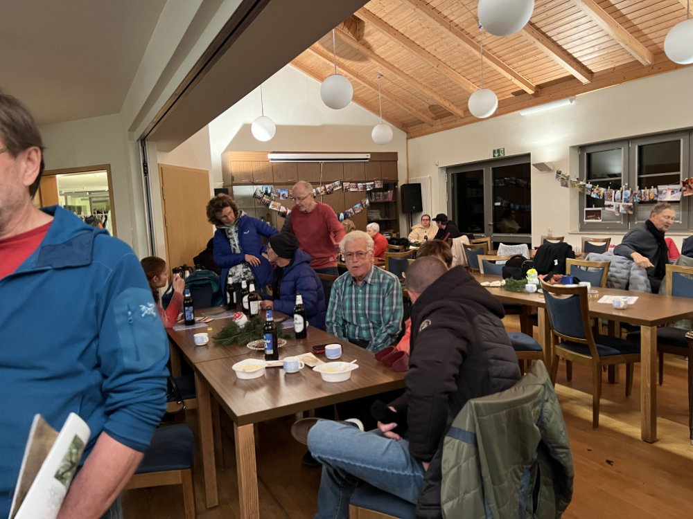Auch kulinarisch war bei der Weihnachtsfeier für jeden etwas dabei: vegetarische Suppen, frisches Grillgut, weihnachtliches Gebäck und selbst mitgebrachte Leckereien machten die Tische voll und die Gäste satt und zufrieden. In gemütlicher Runde wurde geredet, gelacht, erinnert und einfach die gemeinsame Zeit genossen. Traditionell erhielten außerdem alle Anwesenden die neue Ausgabe des „Bergfreund“, die wieder einmal von Karin und Christian mit viel Herzblut zusammengestellt wurde.