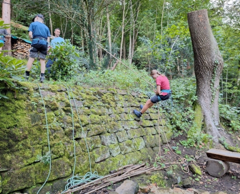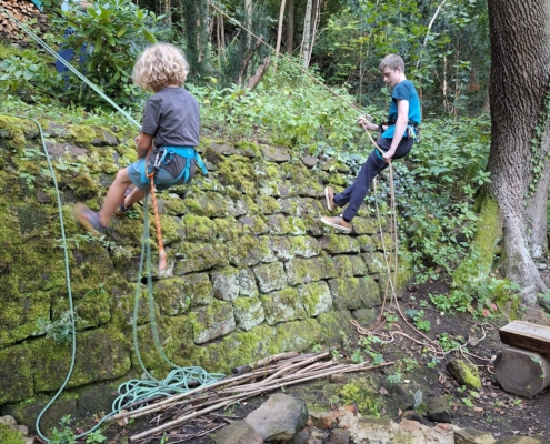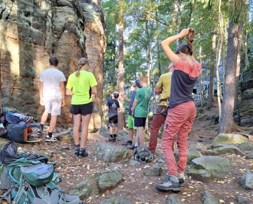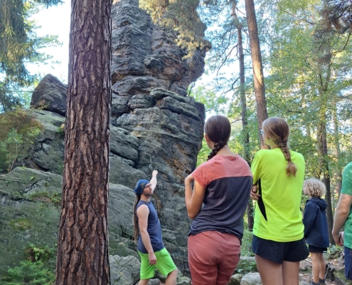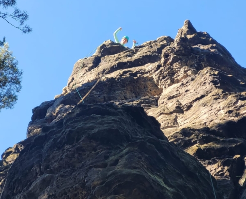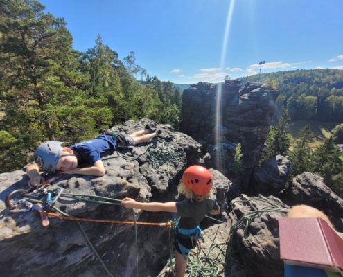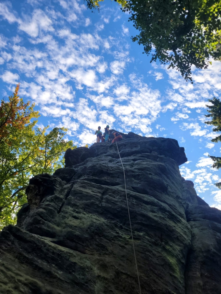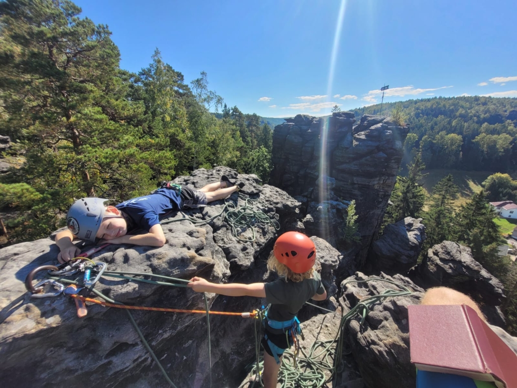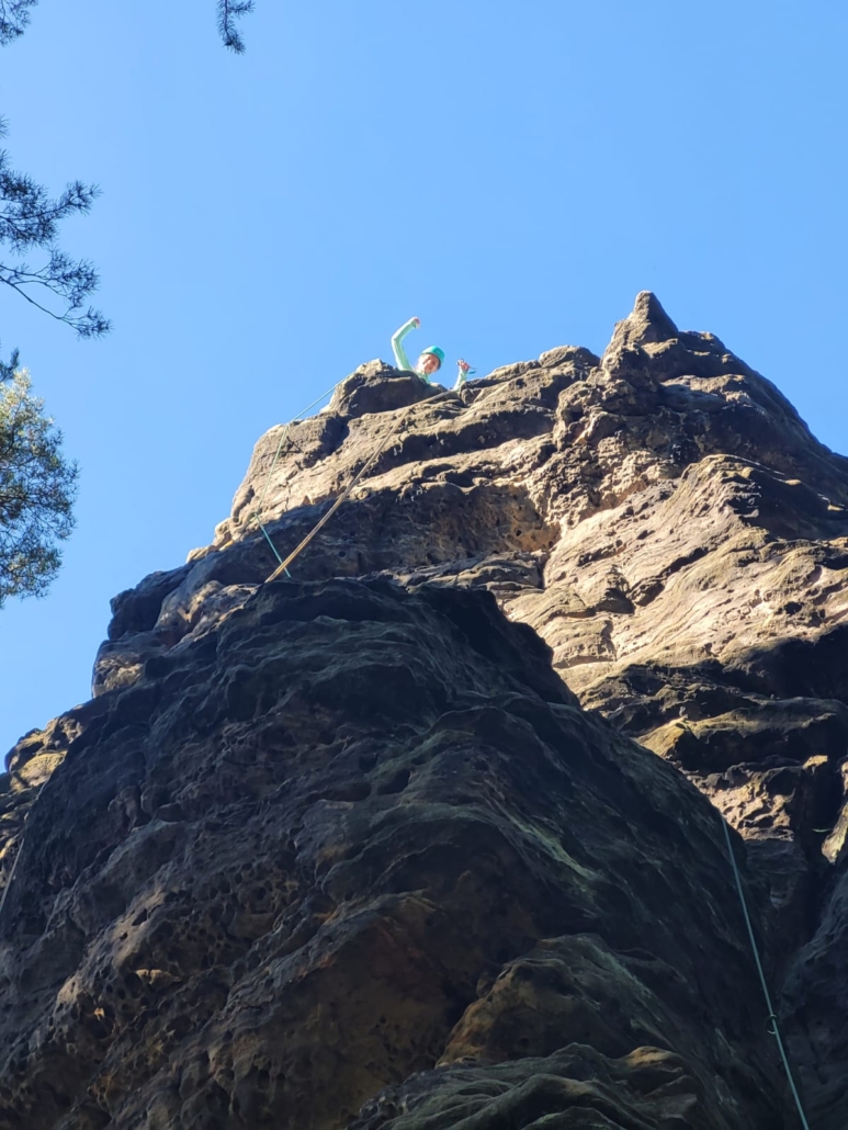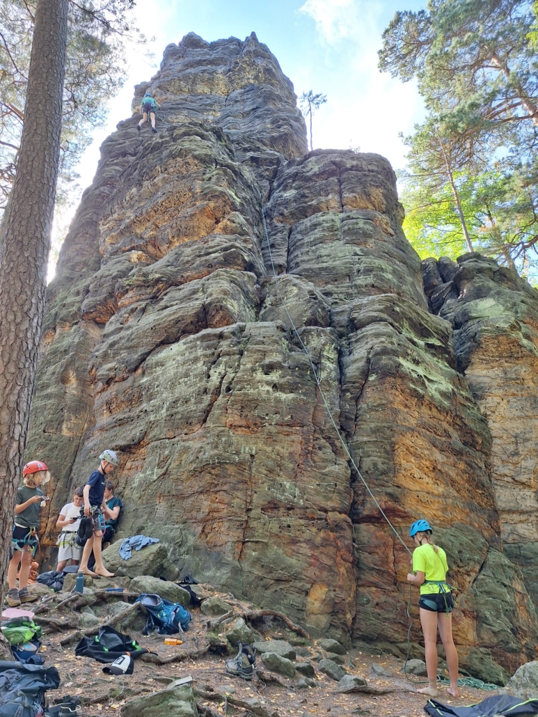Am nächsten Tag geht es in aller Frühe aus dem Bett, kurz nach 7 sitzen alle am Tisch und mampfen ruhig vor sich hin, während sich das Ovomaltine-Glas zusehends leert. Wir wollen so früh wie möglich in Ottomühle sein, den Hotspot um die Mühlenwächter ergattern. Nebst einigen ruhig dastehenden Campern ist der Parkplatz leer. Aufgerödelt mit allerlei Seilen geht es über die Biela durch den ruhigen Wald. Wir stehen zwischen großen und kleinem Mühlenwächter, Ottostein und Daxenstein. So ruhig wie jetzt wird es den ganzen Tag nicht mehr sein. Auf einem kleinen Rundgang erkläre ich meine Eindrücke zu Wegen, die Vorstiegstauglichkeit für Anfänger und die Schlüsselstellen. Nach einer kurzen Meditation wollen alle erstmal ein wenig Sandstein in die Finger bekommen, bevor sie selbst Vorsteigen. Also schnell hoch auf den großen Mühlenwächter, ein paar Schlingen zum Begutachten drapieren und schnellstmöglich die anderen nachholen. Während ich abseile, um den nächsten Felsen zu erklimmen, hat sich die Stimmung unten deutlich geändert: jetzt wollen doch fast alle selbst Vorsteigen! Ganz selbstverständlich und entspannt werden meine Schlingen begutachtet, ausgebaut und durch die eigenen ersetzt. Von Angst: keine Spur. Der kräftige Duft von Selbstvertrauen erfüllt den Wald …riecht ein wenig wie Moschus… wer weiß. Auch der Nordweg auf den kleinen Mühlenwächter wird an meinen Schlingen ohne jegliches zögern von Hilda Vorgestiegen. „Auf den letzten 4 Metern liegt keine Schlinge? Ach naja, ich kann die Wand ja locker klettern. Kein Thema.“ Voller Freude seile ich ab und muss dann vergebens nach einem Sicherungsmenschen suchen: Eric, Anna und Firle üben sich entspannt mit Lenny am großen Mühlenwächter, Theresa und Hilda gehen den Winkelriss am Daxenstein an und Aaron und Julian sind mit Tillmann im Südostweg am Ottostein. Ich stehe also mutterseelenallein auf weiter Flur. Keiner braucht mich. Irgendwie schade… Ich will doch selber klettern! Aber… die anderen auch! Und sie haben Bock und trauen sich. Dieser Moment macht mich einfach glücklich und stolz. Das Training am Sedlitzer Turm zahlt sich aus: das Aufbauen von Sicherheit und Vertrauen in die eigenen Fähigkeiten. Nach einiger Zeit ziehen die Kinder mit mir weiter zum Zarathustra, hier habe ich eine Rechnung offen. Beim letzten Nachstieg hinauf habe ich mich dermaßen blöde angestellt, sodass ich irgendwie Respekt davor habe. Die Südwand geht es hoch mit einer Menge Seilreibung… Schlingen legen muss geübt sein und werden. Während ich nachhole, kann ich auf dem Daxenstein Theresa und Hilda beobachten, die gerade ihren Gipfelerfolg feiern. Aus meiner Sicht und auch als Fazit unseres Tages: dort sollte man sicher Schlingen legen können, so ganz offensichtlich liegen sie zumindest unten nicht im Riss. Im Anschluss gehen wir zum Zarathustra-Junior, der alte Weg ist schnell gemacht und so wird auch der Ostweg von oben gesichert geklettert. Ein schöner Weg zum Rissklettern. Nur beim Sitzen auf dem Felsen bin ich verwundert: aus der Ferne schallt immer eine Klingel und es ruft „Hilfe!“. Gespannt lausche ich. Nichts. Kein Schrei, kein Stöhnen, keine Sirene. Plötzlich: wieder ein Klingeln! Aber diesmal gefolgt von: „SIEHME!“ Ich muss laut lachen. Der Kiosk von Ottomühle mit seinen ikonischen Essensschreiern scheint ganz in der Nähe zu sein.