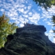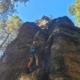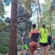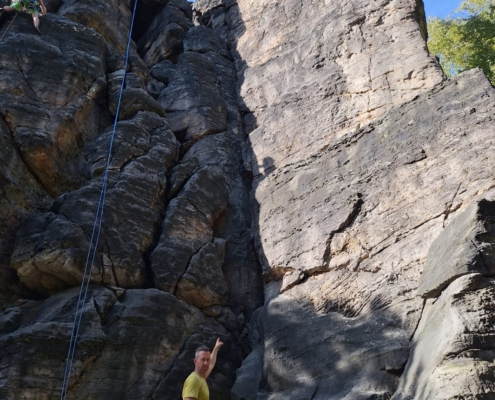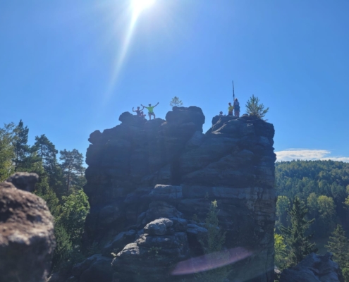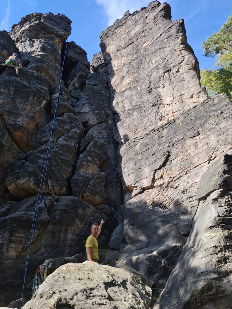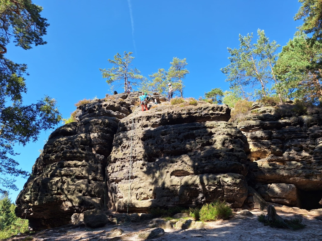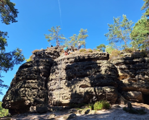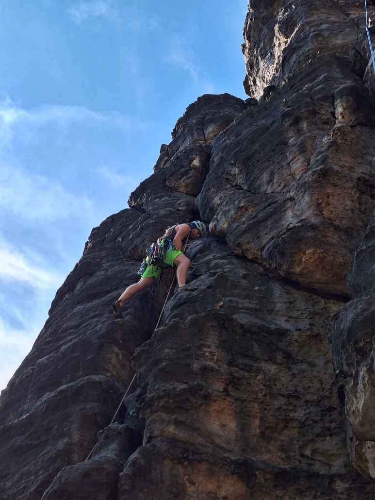 Auf geht es nach Cunnersdorf und von dort zur Dicken Berta. Heute werden vor allem Schlingen gelegt was das Zeug hält. Ich kann gar nicht so viele Wege aufzählen, wie geklettert wurden, obwohl heute mehr das Finden, Austesten und gekonntes Schlingenlegen im Vordergrund stehen. Auch anspruchsvolle Anfängerwege wie der Westweg werden von Hilda und Firle bezwungen. Die breiten Grinsebäckchen sind einfach ein toller Anblick. Eric schnappt sich auch meine Schlingen und sucht sich einen Kaminweg auf die Berta. Souverän, verspielt und entspannt erforscht er den Fels nach möglichen Sicherungen. Als kleines Highlight am Ende lacht mich noch der Talweg an. V und mit ordentlichem Überhang. Der Einstieg macht mir schon etwas zu schaffen, mit den Füßen auf Bauchnabelhöhe antreten, bevor mit einem langen Zug die linke Hand einen bombigen Henkel findet. Eine einlitzige Bandschlinge liegt schon im Riss und sichert das gröbste ab. Ich frage nach Rat bei Eric, unserem Boulderspezialisten. Dieser bindet sich kurzum ein, packt die Henkel und hängt kurz darauf an der Wand. Kurzes Antreten, hochschnellen und er ist eine Etage weiter oben. Meinen Einwand, er habe gar keine Schlingen dabei, überhört er gekonnt und steigt weiter auf das Band. Das sah einfach mal viel zu einfach aus. „Andie, hier oben ist eine riesige Sanduhr!“ – Musik in meinen Ohren. Kurzerhand eine Bandschlinge mir Exe hochgeworfen und schon sind Eric und das Seil sicher. Jetzt bin ich an der Reihe, Eric gibt mir das Seil und ich komme nach. War gar nicht so schwer. Aber von oben gesichert klettert sich das auch deutlich entspannter. Kurzer Quergang nach rechts und die nächste überdimensionierte Sanduhr ist gelegt. Ab hier geht es überhängend an großen Henkeln in die Ausstiegsreibung. Schlingen liegen auch gute, aber der Übergang in die Reibung will mir einfach nicht gelingen, immer wieder steige ich hoch, um kurz darauf wieder abzuklettern und die Arme auszuschütteln. Beim 5. Versuch fasse ich mir ein Herz und hoch geht’s. Leider stehe ich lange nicht so sicher wie gewünscht. Leichte Panik steigt auf. Der Kopf schon in einem toten Baum, die Hände im Heidekraut, der Weg sandig und die Füße am Weggleiten. Kein schöner Moment. Aber jetzt geht’s hoch! Gesagt getan. Erleichtert stehe ich kurz darauf sicher im Heidekraut. Aber auch meine Nachsteiger lässt der Weg nicht kalt, in der heißen Nachmittagssonne ist es auch für Eric, Hilda und Theresa eine Herausforderung.