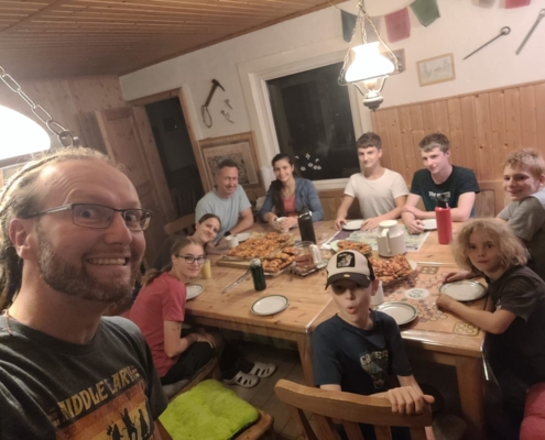 Langsam quengeln die Kinder mit Hunger und wollen zurück zur Hütte. Allmählich zieht auch die Kienäppel-Schlacht, die mitten im Wald angezettelt wurde, auch nicht mehr. Als wir endlich aufbrechen zum Parkplatz ist es auch schon 18:00. Geschafft und glücklich und voller Eindrücke geht es zurück zur Hütte, die Nudeln sind schnell gekocht und gemampft, ein paar Pizzastullen dazu, der Putzplan für die Abreise erstellt und der Abend geht mit Werwolf und Schach entspannt zu ende.