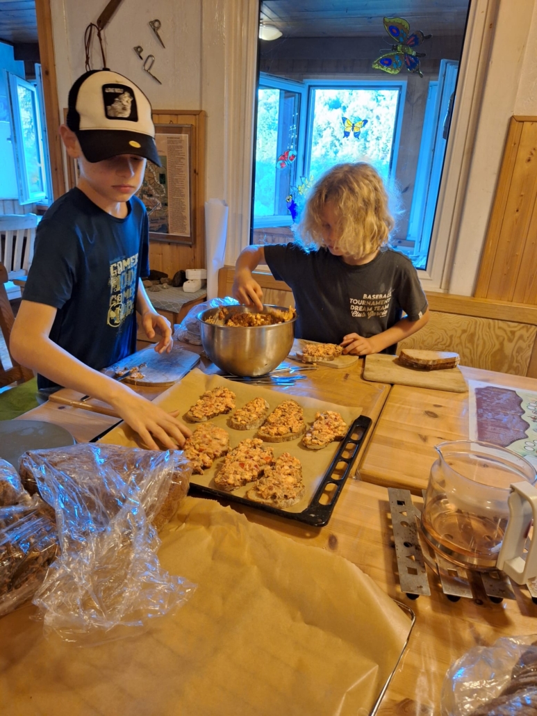 Freitag Nachmittag. Alles eingepackt, mit drei Autos geht es zur Sedlitzer Hütte. Bei mir hatten neben knapp 100 Brötchen, 6 Seilen, 5 Rucksäcken und ca. 5 kg Käse auch 2 Kinder Platz. Der Tag an sich ist zwar grandios, aber die Sonne geht im Herbst schnell unter, klettern ist heute nicht mehr drinn. Stattdessen üben wir Abseilen neben der Hütte hin zum Lagerfeuerplatz. Am morgigen Tag werden die Kinder oft auf sich allein gestellt sein. Wir sind nur 3 Erwachsene auf 7 Kinder mit einer großen Auswahl an Gipfeln. Abends gibt es Pizzastullen, die ein oder andere Runde Schach und Werwolf. Außerdem wird gleich die Tomatensauce für den nächsten Tag bereitet. …Nach einem langen Klettertag muss es schnell Essen geben…