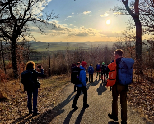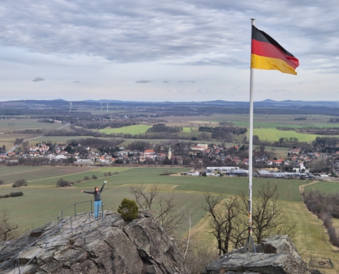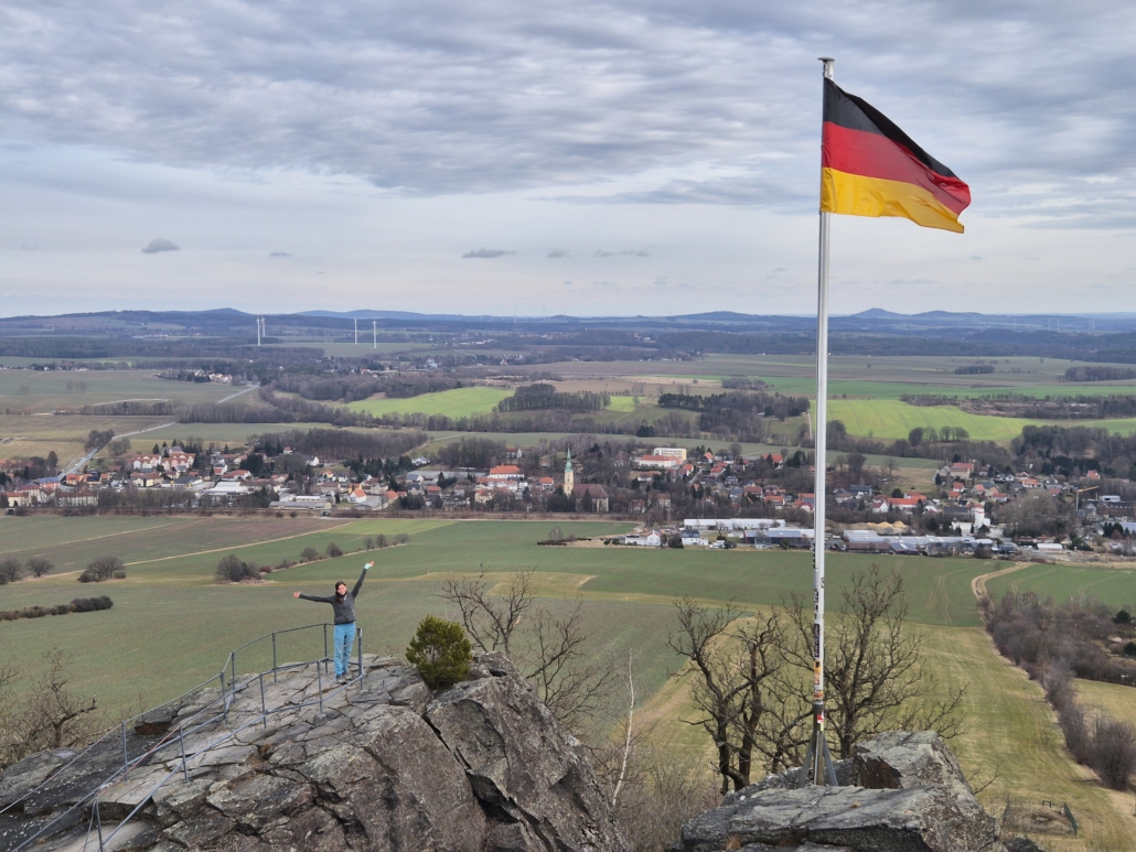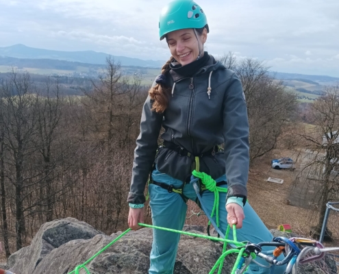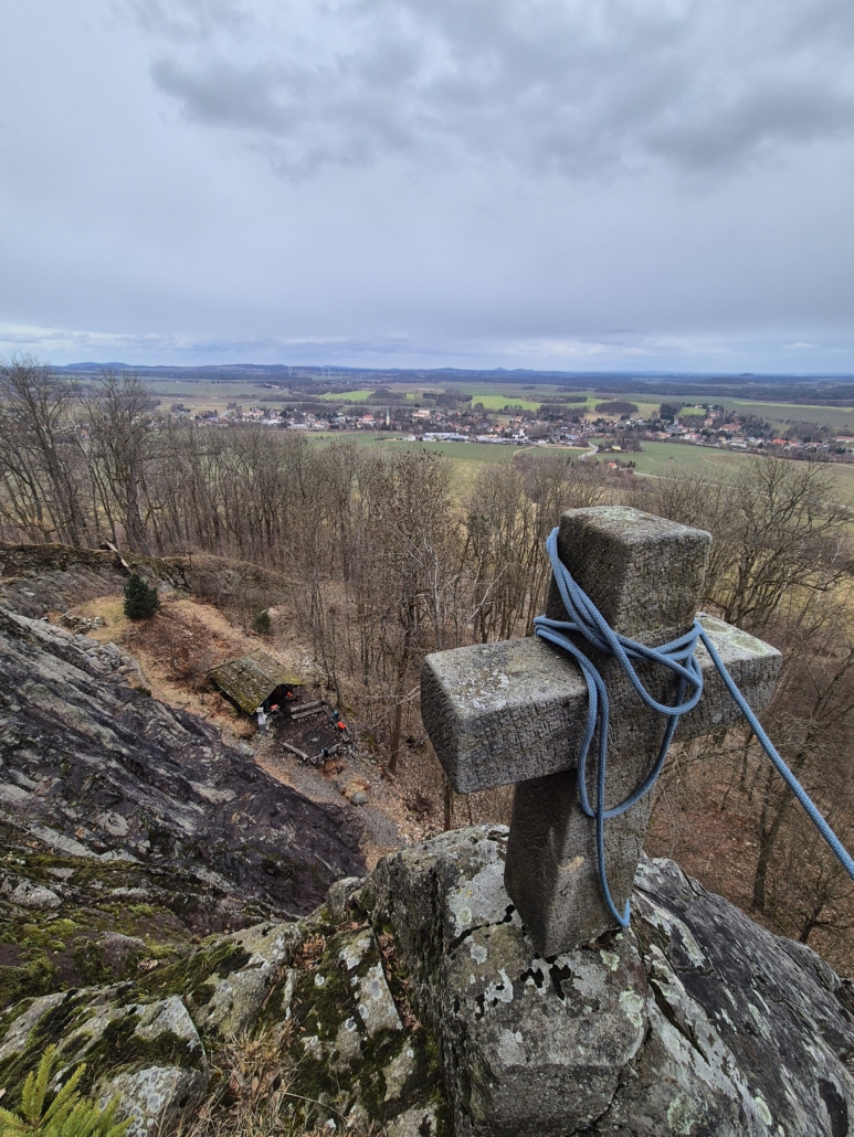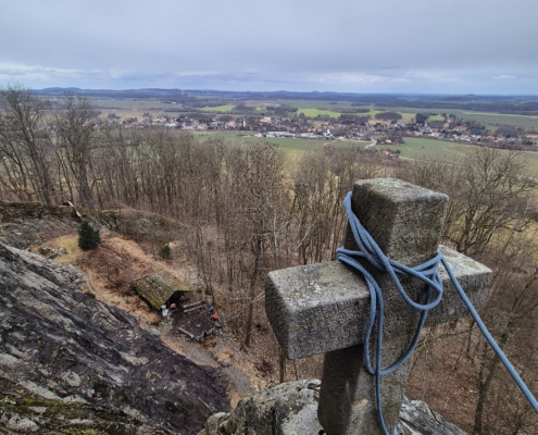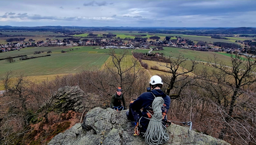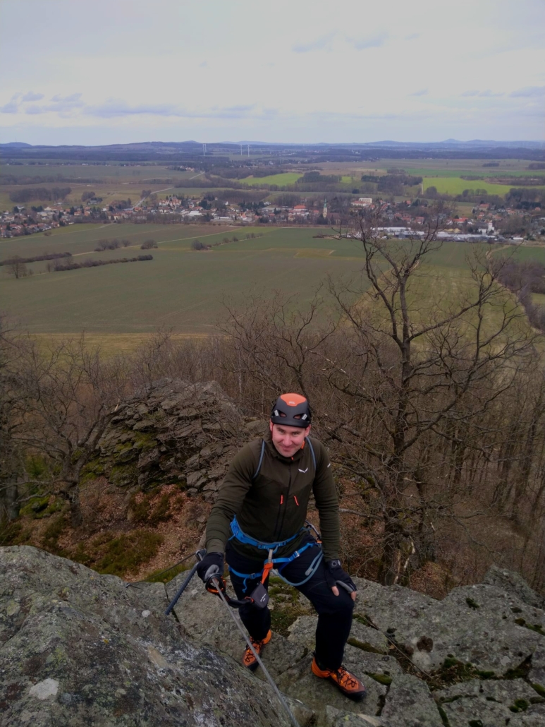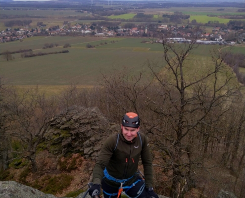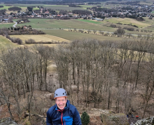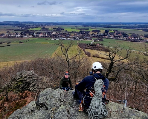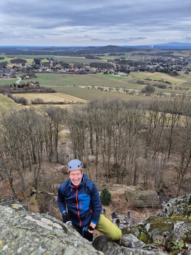 Mit jedem Zug wuchs die Sicherheit – und der Appetit auf mehr. Als der Fels nach dem Mittag weitestgehend trocken war, wurden unten im weiter unten gelegenen Gebiet weitere schöne Routen geklettert. Und eine herrliche Aussicht ins Zittauer Gebirge gab’s gratis dazu!