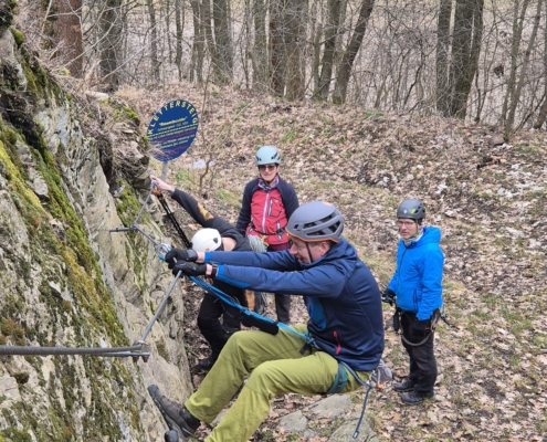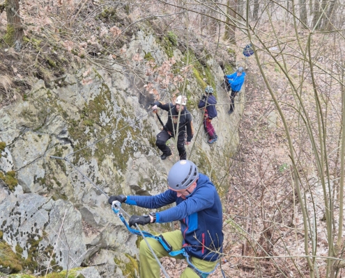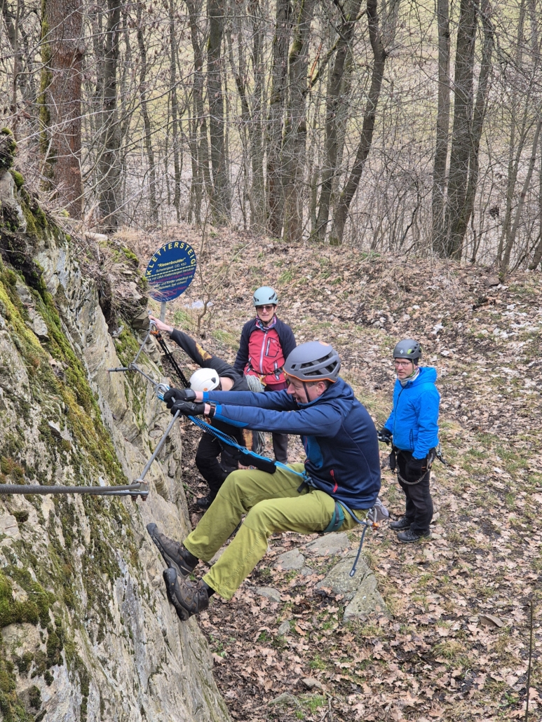 Ein paar Unermüdliche wollten mehr als “nur” klettern und schnallten sich das Klettersteigset an. Und weil’s so schön war, gab’s danach noch zwei Seillängen Abseiltraining obendrauf. Sauberes Einrichten, konzentriertes Abseilen – und natürlich der obligatorische prüfende Blick nach unten. Alles lief rund und sorgte für zufriedene Gesichter.