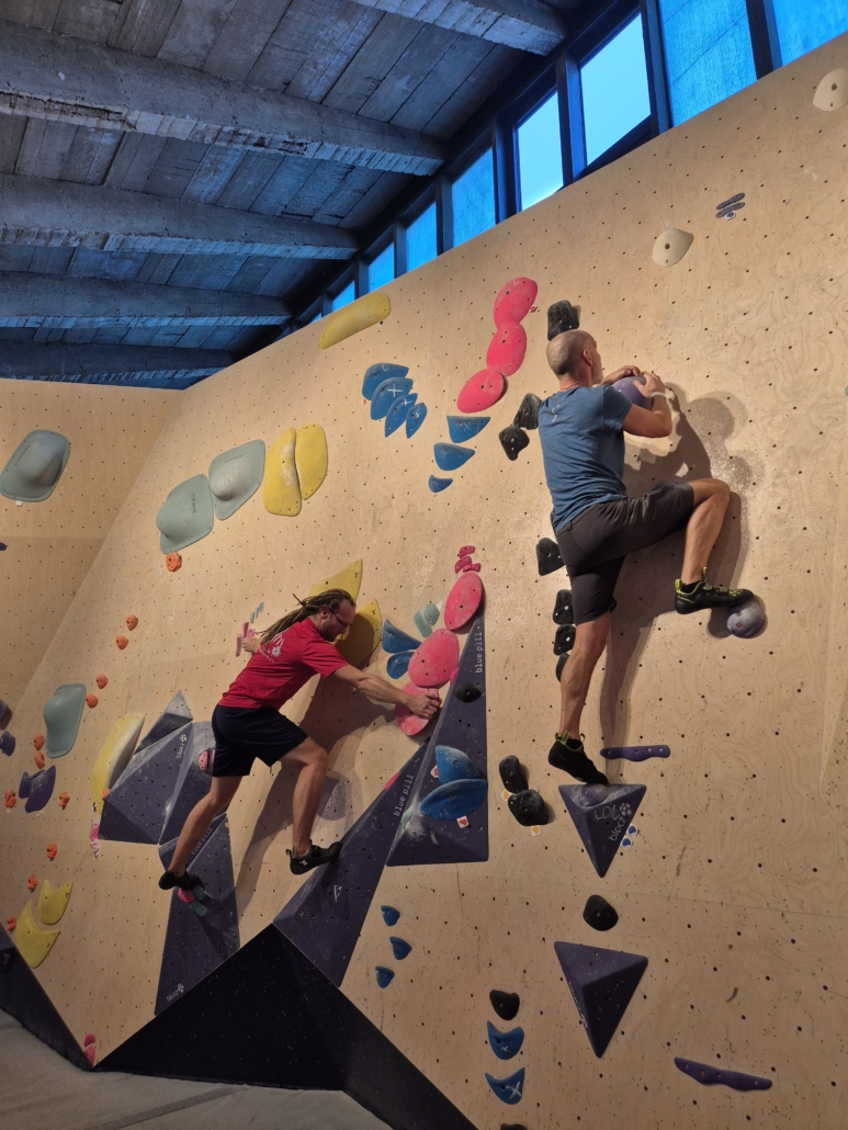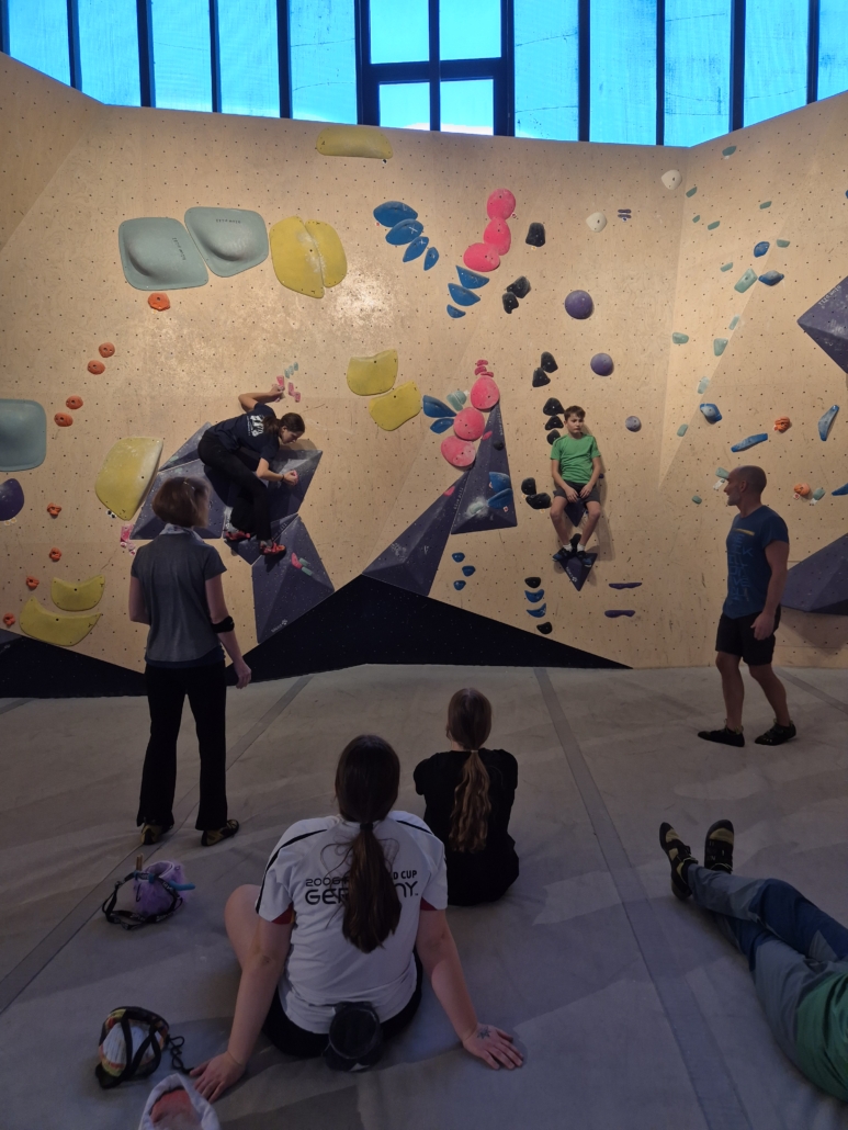 • Das Kollektiv-Grübeln: Wenn die Kraft nicht reicht, muss das Hirn ran. Vor den technischen Routen bildeten sich kleine „Fachbeiratssitzungen“, um die komplizierten Boulderprobleme gemeinsam zu lösen. Teamwork vom Feinsten!
