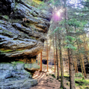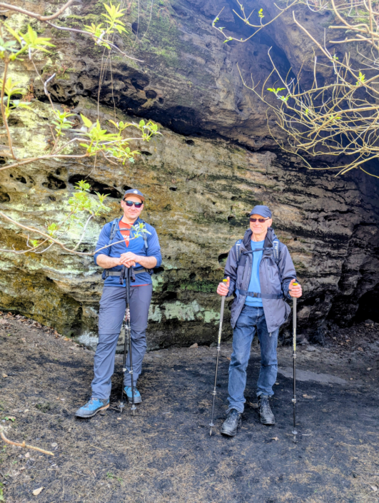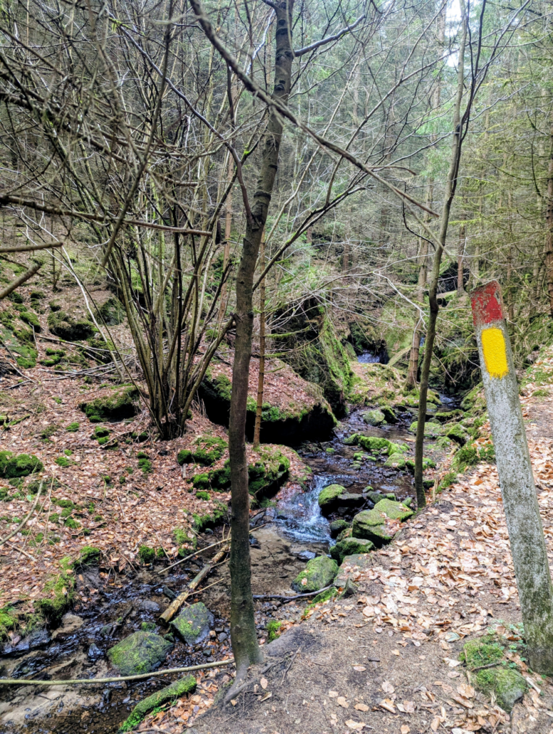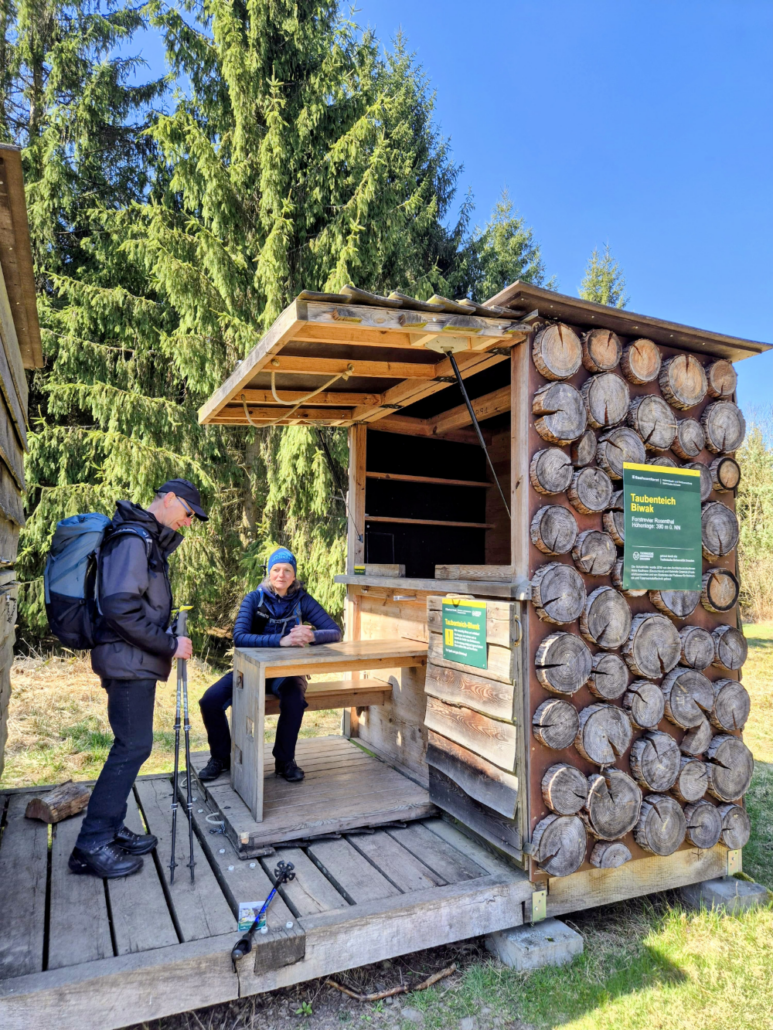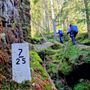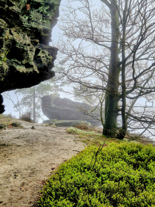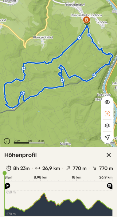 Am 11.04.2026 startete ein stark dezimierter 3köpfiger Bergfex ab Reinhardtsdorf-Schöna Richtung Forststeig und damit in das Herz der Sächsisch-Böhmischen Schweiz. Angekündigt waren 27 km und ca. 710m stetes auf und ab. Und ja, es war kein Spaziergang, aber auch keine Ochsentour. Zum Schluss hatten wir eine reine Laufzeit von 5:38h und 770 Höhenmeter. Im mystischen Nebel ging es auf den großen Zschirnstein und ab dem steilen Abstieg von diesem Gipfel begleitete uns bester Sonnenschein und blauer Himmel. Wir fanden schnell unseren gemeinsamen „Tritt“ und konnten entspannt mehrere Trinkpausen, ein zweites Frühstück und ein Mittagspicknick an der Grenzbaude einlegen. Lange Strecken führten uns auf schmalen Grenzpfaden durch traumhafte Natur fernab von der Zivilisation. Das Herz hüpfte beim entdecken lebendiger Felsformationen, einiger Quellbäche und reichlich nachwachsenden jungen Bäumen in den vormals durch Bruch sehr trist wirkenden Flächen. Der Forststeig ist eine der wenigen echten Trekkingtouren in Deutschland, bei der man legal im Wald in kleinen Hütten Quartier nehmen, biwakieren oder Zelten kann. Auf unserem Teil der Strecke liegt das Zschirnstein-Biwaq mit Gipfelblick, die Grenzbaude auf einem kleinen Abstecher vom Grenzweg und das Taubenteich-Biwak, ohne Tauben, aber dafür mit hunderten von Fröschen. 3 von 11 ausgewiesenen Trekkingplätzen. Ein paar Kuriositäten und Begegnungen der besonderen Art waren auch dabei.