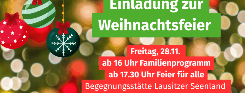 das Jahr neigt sich dem Ende zu – und wir möchten es gern wieder gemeinsam mit euch in gemütlicher Runde ausklingen lassen! Dazu laden wir euch herzlich ein zu unserer Weihnachtsfeier am Freitag, den 28.11., in der Begegnungsstätte Lausitzer Seenland in Senftenberg, Komoranstraße 1.