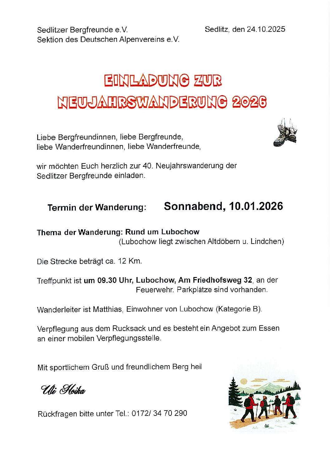 Liebe Bergfreundinnen, liebe Bergfreunde, liebe Wanderfreundinnen, liebe Wanderfreunde, wir möchten Euch herzlich zur 40. Neujahrswanderung der Sedlitzer Bergfreunde einladen. Termin der Wanderung: Sonnabend, 10.01.2026 Thema der Wanderung: Rund um Lubochow […]